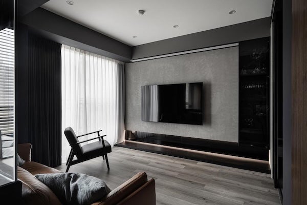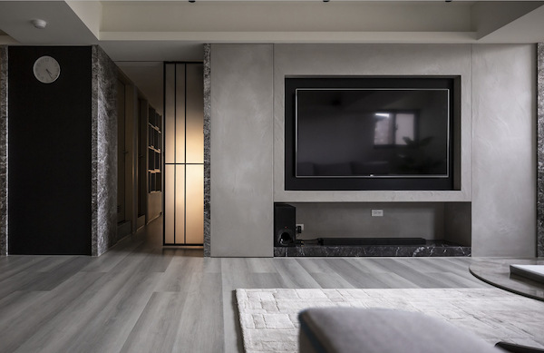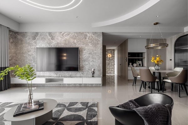 透過大理石、木紋板、藝術塗料…等特殊牆面材質,運用材質拼貼、色塊設計或幾何線條…等手法搭配燈條,讓電視牆成為空間主視覺,不僅能巧妙修飾電視本體的存在感,還能提升整體空間的藝術氛圍。