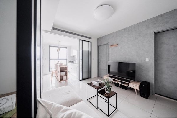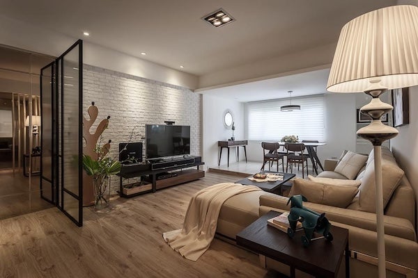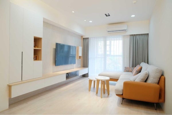 利用全牆面櫃體,結合電視、書櫃、展示架與儲物櫃,不僅使客廳擁有大量的收納空間,也賦予空間設計感,適合希望環境整齊以及有許多物品需要收納的家庭。