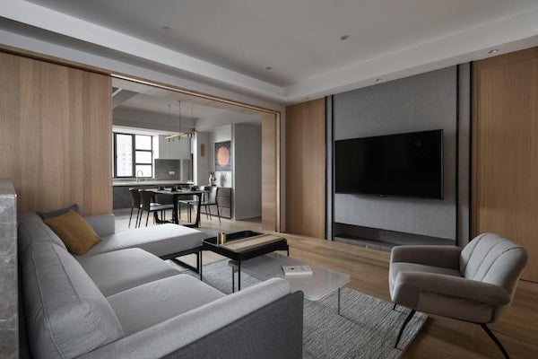 如果客廳走道空間有限,可以將電視櫃嵌入牆體,不僅能維持動線暢通,還能增加電視牆的使用機能。