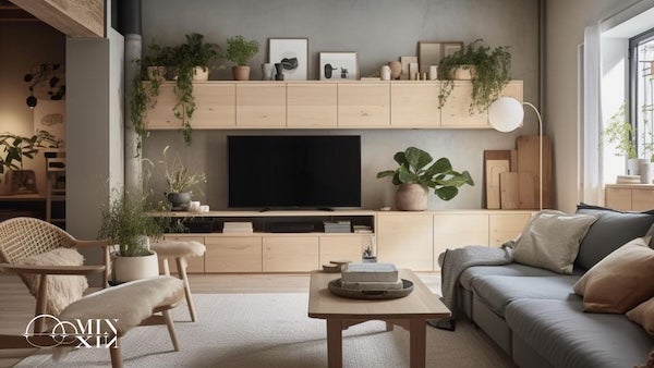 北歐風格的電視櫃設計強調溫潤的木質調與簡約線條,色調以淺木色與中性色為主,展現輕柔明亮的視覺感受。以下案例中,設計師還擺放許多綠色植物,增添客廳的自然感,讓客廳更顯舒適自然。