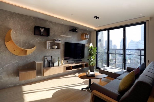 複合式電視櫃結合多種電視櫃樣式的設計特點,例如:底部使用懸浮櫃體、電視上方則採用層板設計,或是根據需求添加貓跳台、太空艙…等寵物元素,打造最符合屋主需求的個性化設計。