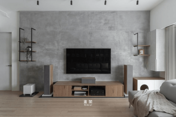 工業風電視牆強調原始材料與率性質感,色彩配置以灰、黑、白...等低飽和度色系為主。主色油漆可選用水泥灰、深灰色、黑灰色,營造出復古懷舊的沉穩氛圍;跳色牆面建議使用仿清水模特殊漆,以水泥質感與自然紋理,強化工業風美感。
