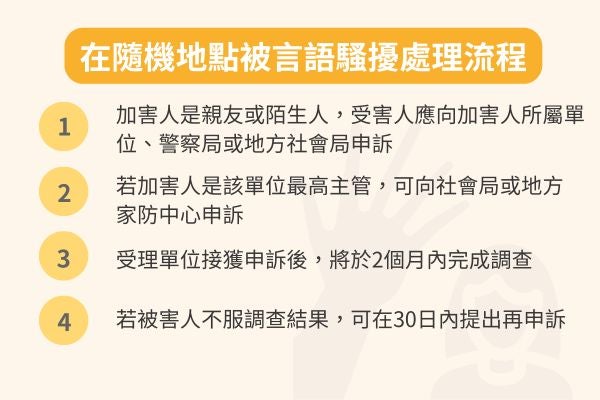 若在公共場所或隨機地點遭遇言語騷擾,受害人應向警察機關、加害人所屬機構或地方社會局申訴;若加害人是該單位最高主管,則可向社會局或地方家防中心申訴。
