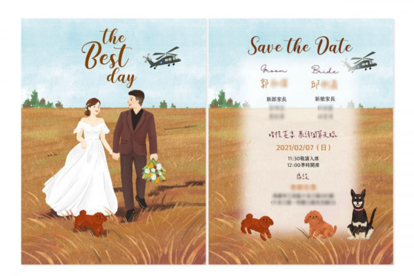 西式喜帖的內容設計較為靈活,不受固定格式限制,通常以橫排方式書寫,並可以自由加入富有情感的愛情宣言。