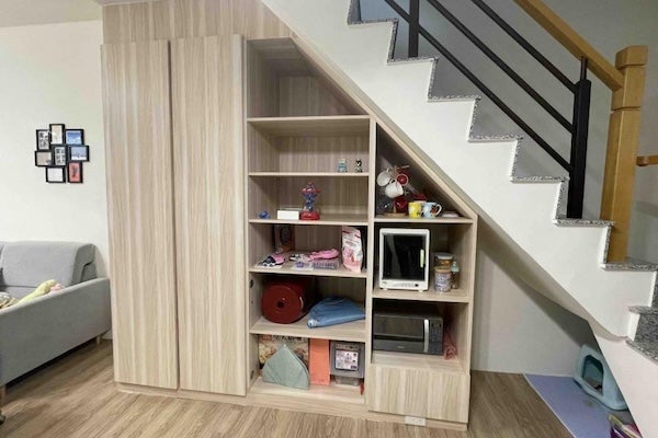 設計師巧妙利用樓梯下方的空間,將畸零角落轉化為實用的收納區域,內部規劃設計多層櫃體與抽屜,充分發揮空間容量;開放式與封閉式的收納空間,既方便擺放書籍、裝飾品,也能隱藏日常雜物,保持室內整潔,打造簡約且重視收納機能的系統櫃。