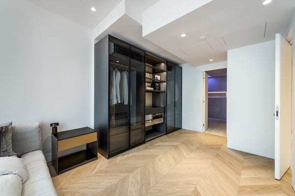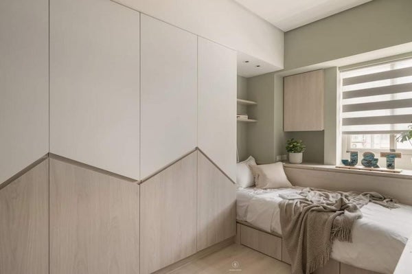 設計師透過淺色調營造出臥室的清新氛圍,跳色櫃門搭配隱藏式把手,提升房間的現代感與時尚感,讓空間視覺不再單調;窗台旁也規劃壁龕式展示架與窗邊收納櫃,有效利用畸零空間。整體設計兼具實用與美觀,完美詮釋現代居家對於整潔與質感的追求,展現設計師對細節與空間美學的用心。
