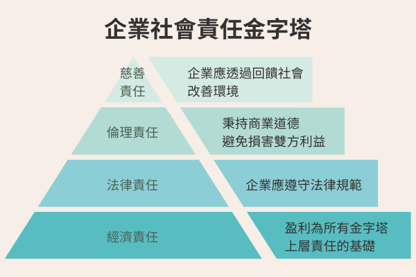 CSR(Corporate Social Responsibility,企業社會責任),強調企業對社會和環境的主動責任,也就是企業在追求盈利的過程中,也應該提供社會相對應的回饋,並對環境的永續發展有所貢獻。而企業社會責任又可用企業社會責任金字塔(Carroll Pyramic of CSR)中經濟責任、法律責任、倫理責任及慈善責任四個層次來解釋: