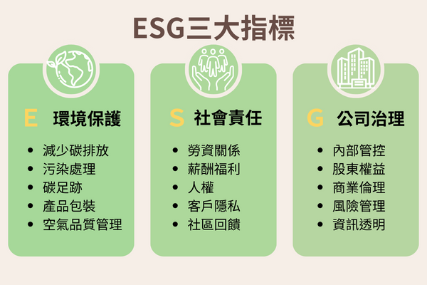 ESG 代表環境(Environmental)、社會(Social)、治理(Governance)三個面向,是一種評估企業或投資項目綜合性表現的方法,透過考慮這三方面的因素來評估企業的永續性和責任感,以下整理ESG三面向各自涵蓋的範圍: