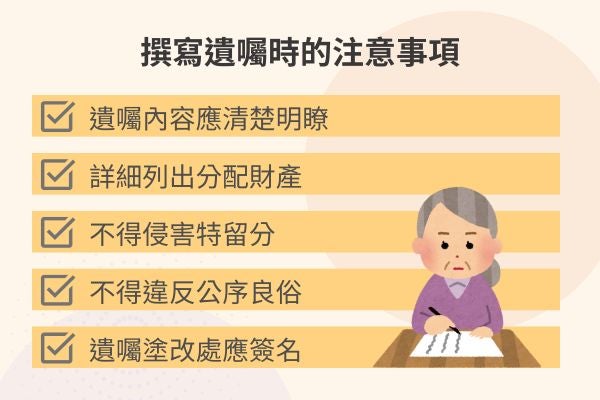 - 遺囑內容應清楚明瞭:撰寫遺囑時應使用簡潔明瞭的表達方式,避免使用模糊或容易引起歧義的詞語,例如:不要使用「OO將繼承我大部分的遺產」,否則容易令人無法確實理解應分配的財產類型及數量。