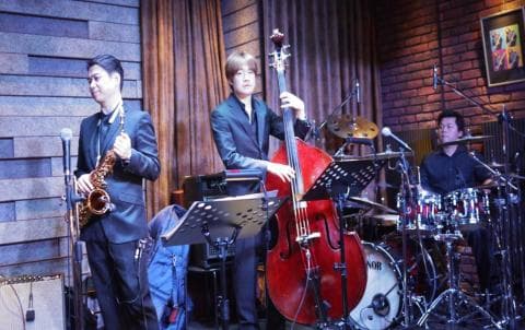 舞臺燈光映照鼓手與歌手