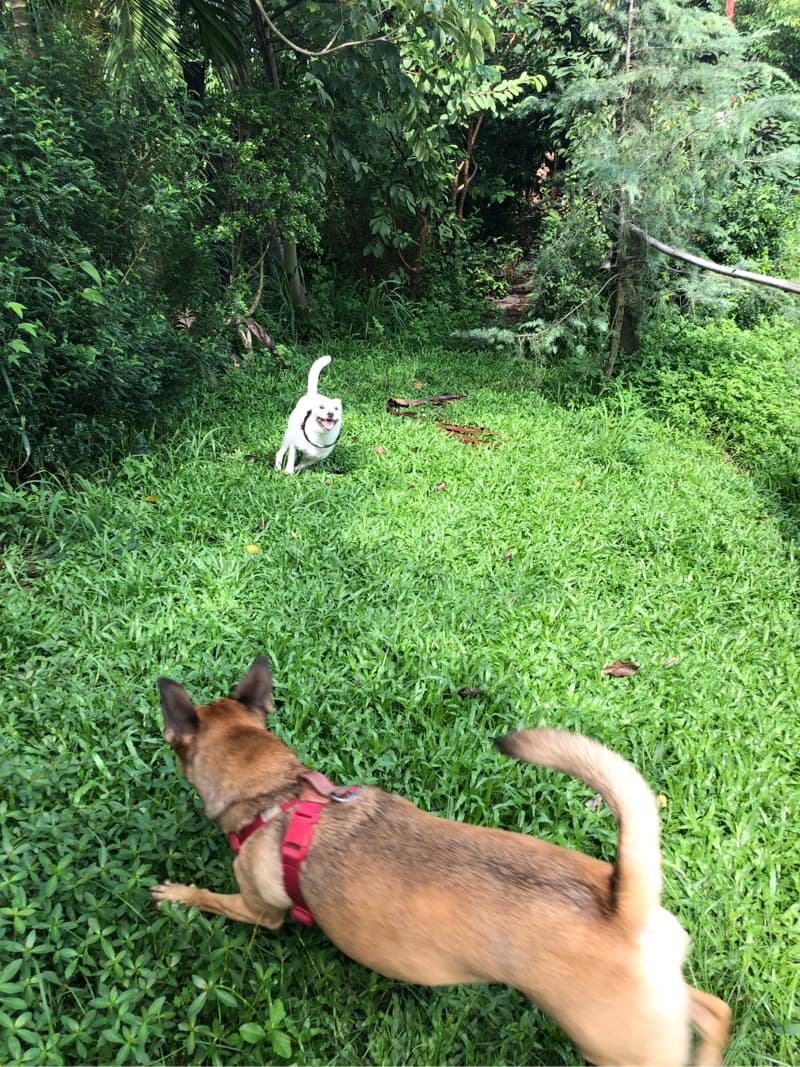 • 這張照片是两只狗狗在草地上玩耍,一只黑白色,一只棕色,它们都伸着舌头,看起來很开心。