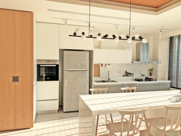 嵌入式設計需要送回工廠製作,雖然美觀,但卻需要支付更多的工錢,如果預算有限,建議您取消嵌入式設計,改以櫥櫃、層架收納電器用品與配件。