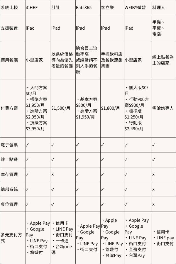 以下為您整理比較iCHEF、肚肚、Eats365、客立樂、WEIBY微碧、料理人...等台灣常見餐飲POS系統的主打客群、優缺點、價格方案、適合的餐廳類型: