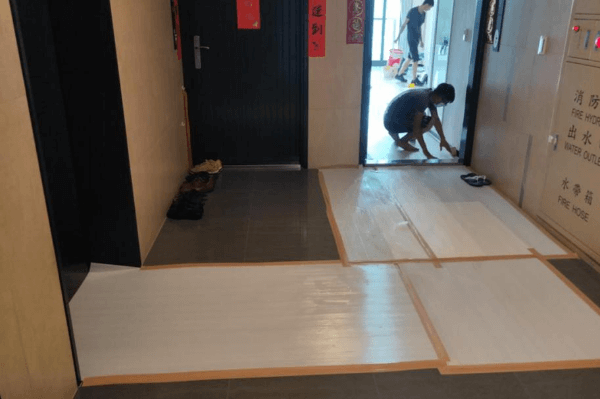 搬運建材與工具以及施作工人來回走動時,會產生大量粉塵,容易使社區公共區域與案場的地板髒亂,此外,如果在搬運過程中不慎造成物品摔落地面,容易使地板出現裂痕或刮傷,因此裝修公司會在地面覆蓋瓦愣板、木夾板等保護材料,以免造成地面損壞。