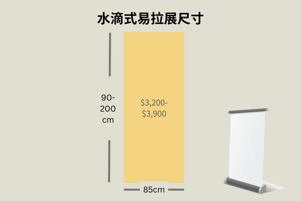 水滴式易拉展的展示架桿身為可調式伸縮桿,可運用於不同尺寸的海報,其尺寸長度大約可在90cm-200cm進行調整,與伸縮式不同之處在於,水滴式易拉展可透過在底座中注水或注沙來增加穩定性,更適合在室外使用,常見寬度為85mm,由於寬度大致相同,所以價格主要是依不同製作廠商而異: