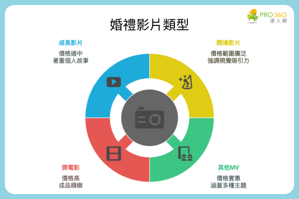 根據PRO360後台報價數據統計,婚禮影片製作價錢約為$1,200-$5,000/部,較精緻的婚禮影片或微電影價格約為$10,000-$20,000/部,婚禮影片長度、影片內容精緻度、照片張數、音樂的多寡、交件期限...等因素皆會影響婚禮影片製作的費用。以下將詳細介紹婚禮開場影片、婚禮成長影片與各種婚禮MV的價格資訊,讓您與專家洽談時更順利。