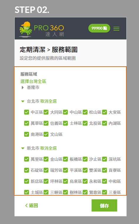 自動報價系統設定為〔預先全選模式〕,遇條件相符之案件時系統將主動報價,因此,請選擇你較偏好的服務地區,讓您的客戶配對更準確。若您的服務方式不受地區所在影響,建議您可以盡可能的勾選所有的地區,以獲取更多的配對機會。