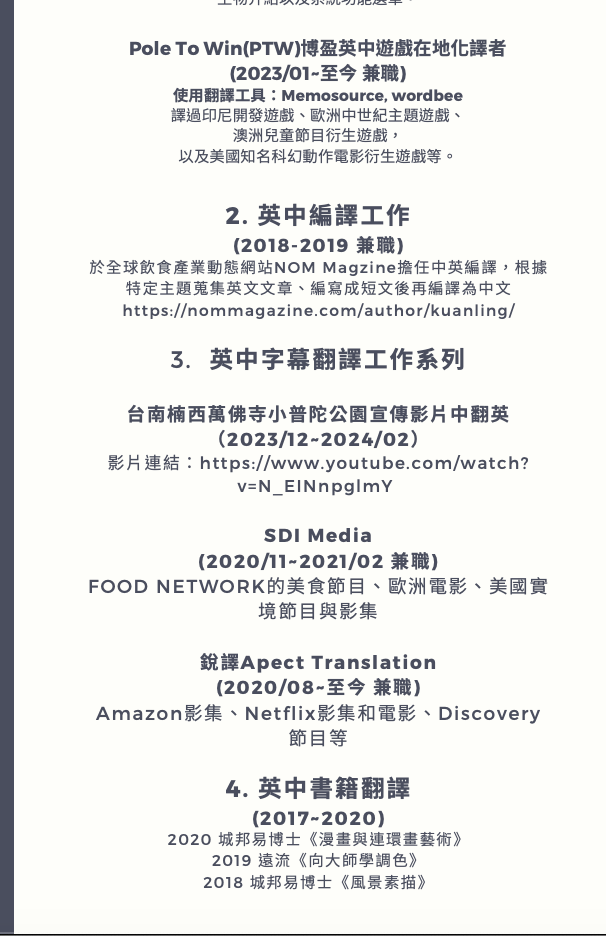 專家介紹 提供英進中、中進英的翻譯服務。 擅長領域:一般文件、書籍、影片字幕、創譯 學歷: 輔大翻譯研究所中英組 成大外國語文學系,主修英文,副修日文 雅思7分 通過日語檢定N1 書籍翻譯作品: 醫療大數據 風景素描 向大師學調色 顯示更多