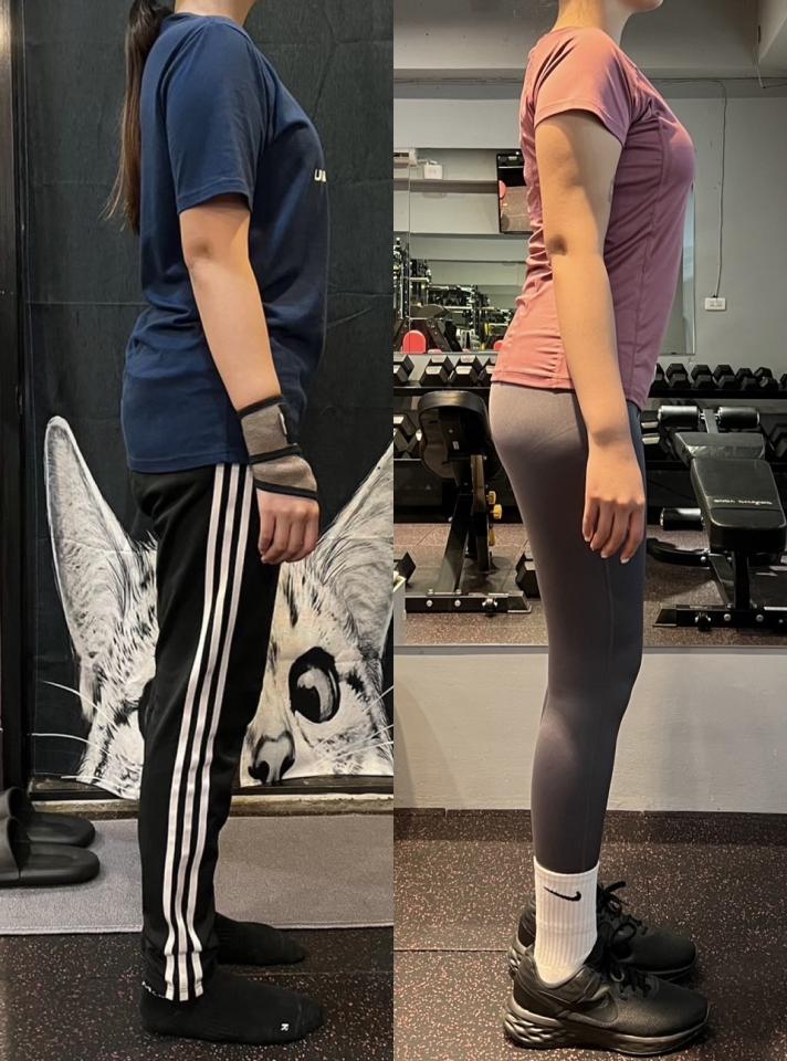 增肌減脂 2 個月後,臀線上提,改善骨盆前移和前傾問題,整個人站立重心回正,背部肌力提升,肩胛後收。