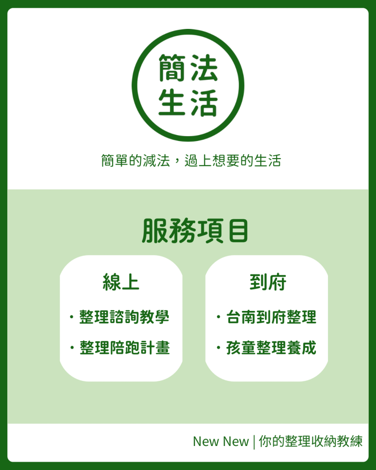 常見問題 1.自我介紹 我是台南的整理師,New New 致力於推廣整理的底層邏輯,而非單單表面技巧。 如果我們理念剛好不謀而合,歡迎預約諮詢。 讓我們都可以用 : 「簡單的簡法,過上想要的生活 !」 2.服務方式 🟢「線上」整理教學 🔸空間健檢反饋 🔸痛點解決方案 🔸整理進度規劃 🔺適合客群: 住在台南市以外的你 想自己親手整理的你 整理疑問找不到人問的你 整理進度卡關延宕的你 想徹底了解整理概念的你 🔺預約制: 2小時 為最小單位 _______________________________________________________ 🟢「到府」整理教學 🔸生活動線規劃 🔸整理收納心法 🔸斷捨離心法 🔸孩童整理教學 🔺適合客群 : 住在台南的你 需要陪伴整理的你 需要養成整理收納的孩童 整理疑問找不到人問的你 整理進度卡關延宕的你 想徹底了解整理概念的你 🔺預約制: 4小時 為最小單位 ________________________________________________________ 🟢學完整理的好處: 🔺家中孩童養成歸位習慣,減輕大人家務負擔 🔺學完可應用在家中各種整理情境 🔺整理遇到瓶頸,可線上預約諮詢 3.收費方式 ( 2025年 11/24至12月31期間預約, 優惠價 ) 🔴線上整理教學 560元/小時 (原價600元) 🔴到府整理教學 800元/小時 (原價850元) ( 2026年 01/01至02/16,期間預約,原價收費 )