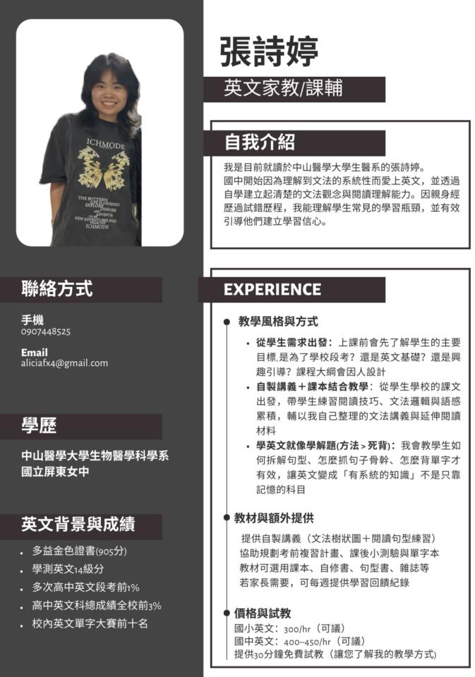 我透過自學累積英文實力,從國中開始因接觸文法系統而真正喜歡上英文學習。清楚的文法觀念是我的強項,也發展出一套自己的學習方法。因為經歷過摸索與試錯,我能理解學生在學習英文時的困難,並擅長引導他們一步步建立信心與能力。我重視培養學生的自學能力,因此教學不只侷限於課本,而是著重於如何讀懂英文、延伸單字與句型、發展閱讀與寫作基礎。