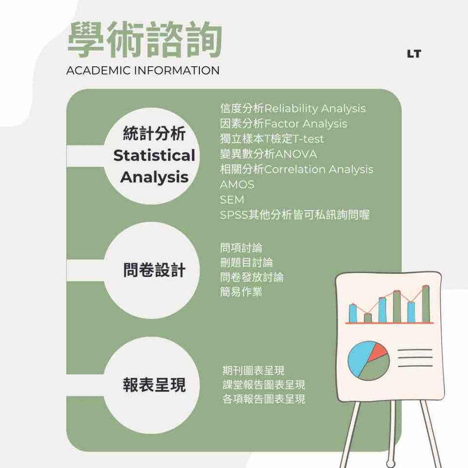 提供「企業ESG諮詢」、「問卷設計」、「市場調查分析」、「SPSS、AMOS等統計軟體結果報告撰寫」、「文案撰寫、排版等各式文書作業」、「配音」