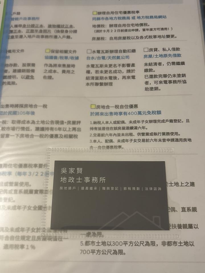 我是地政士「吳家賢」,在這行已經多年,有自己的事務所,幫忙處理過各種登記案件。