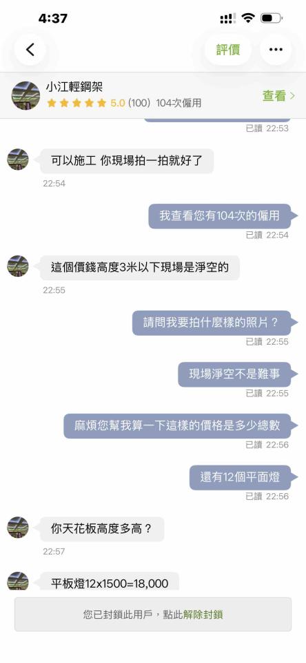 自己過了一個月後,自己來詢問價錢,報價後嫌人家貴就來留1星留言,莫名其妙,連施工都沒施工就來評價,搞得好像一定要符合你的價錢一樣。 人家報價便宜,你可以去找人家,技術活請問有什麼公定價?搞得好像報價低就是價格合理,請問有什麼工作一定要去看現場嗎,還是你的很複雜嗎?你怕會有糾紛,那你可以不要找我就可以了,前面已經沒有再回覆你了,是你自己還要來詢問價錢的,價格不符合你就來評價1星