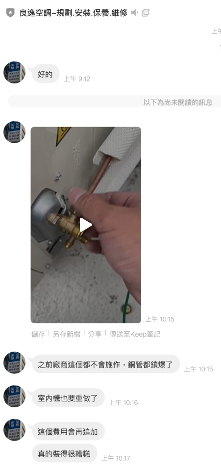 此人慣性說謊 工法差 學徒品質 後患無窮 第一天就詐取我$99400 (75成總價) 佯裝買機器 話說得很滿 三天完工 (一般應先付訂 進場完工再付主要款項) 取得款項後 無限拖延/欺騙 逾兩個月都未完工 大部分工程未完不說 至今一台國際冷氣 未買未提供 即使到警局 還是幾天後送到的拖延之詞 騙取金錢後 百般拖延 浪費消費者時間 走法律途徑 該好好想想怎麼做人吧!! 此等不孝業者 願眾所周知