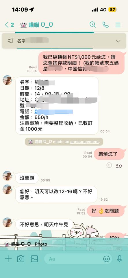 同時有接其他業務,比如:寵物保姆、網拍上架、代駕、代織圍巾、手語翻譯、臨時看護、微型搬家、居家清潔、空屋清潔、搬家清潔…等。