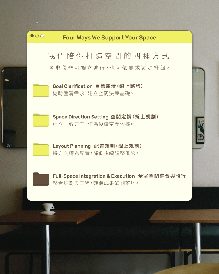我們提供線上軟裝設計(傢俱、飾品配置)多種方案、老屋翻新、租屋改造、居家與商業空間設計規劃。
