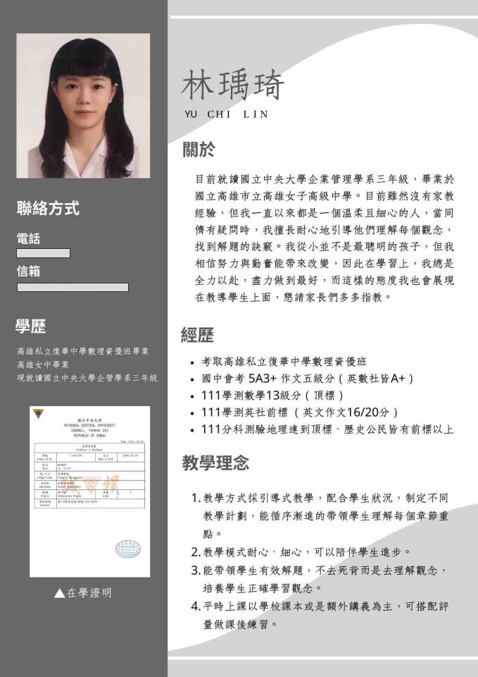 常見問題 1.自我介紹 📍學歷 高雄女中畢業 現就讀國立中央大學企管學系 📍家教科目 國小伴讀/國小全科 國中數學、英文、社會伴讀 2.專業背景 📍經歷 國中就讀數理資優班 國中會考 5A3+ 作文五級分 111學測數學13級分(頂標) 111學測英文、社會前標 111分科測驗地理達到頂標、歷史公民皆有前標以上 3.服務方式 📍教學方式:實體、線上皆可 4.收費方式 📍期望待遇(可議): 國小:450/hr 國中:550/hr