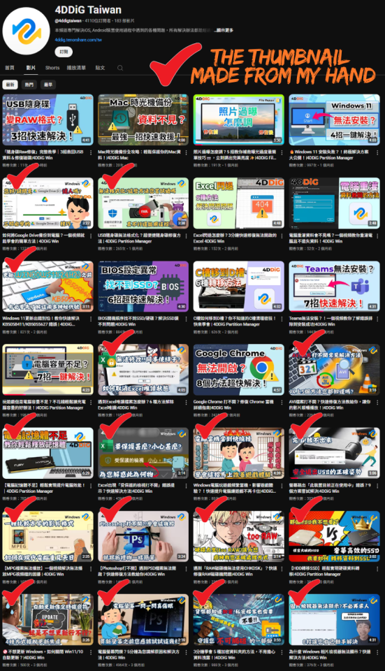 我曾與 知名資料修復軟體公司 4DDiG 台灣官方 YouTube 頻道長期合作,至今參與製作超過百部影片,從腳本內容錄製、剪輯、字幕處理、封面設計到最終成品交付,一手包辦,並且從未延誤交期,作品品質受到客戶高度肯定。這段經歷也讓我更加了解品牌內容製作的完整流程,能協助您快速將想法變成可上架的優質作品。