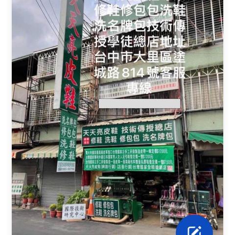 專家介紹 天天亮皮鞋專業修鞋修包包洗鞋洗名牌包技術傳授學徒總店、本店技術已傳承第三代本店師傅以三代不斷的技術研究服務於客戶也以職人的精神服務與大眾、專業的技術專住的修洗,每一雙鞋子和包包、已達到每一位客戶所需求的理念,本店師父也不斷地創新以最高的技術服務與每一位客戶的鞋子包包修復和清洗本店地址台中市大里區塗城路814號客服專線09-8599-2798歡迎來電洽詢 顯示更多