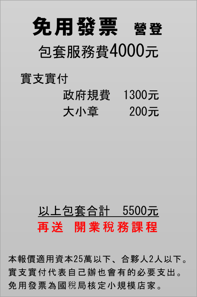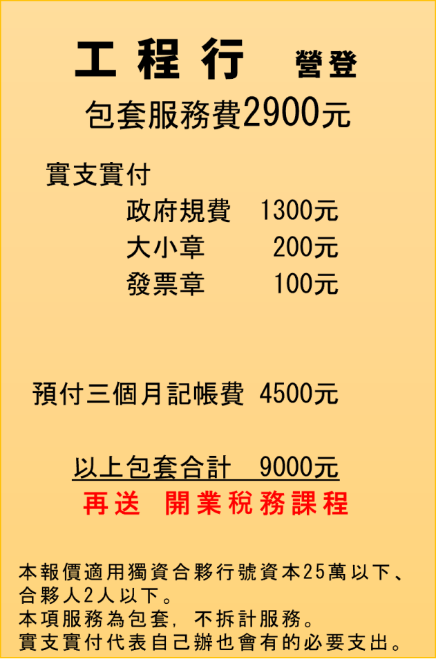 常見問題 1.自我介紹 冠優專辦1人公司、商行、工程行的營登、報稅,提供稅務輔導、節稅諮詢、各類商業服務。 2.專業背景 專辦中小微型新創事業營登,曾任中小企業處創業顧問,設立營登超過3000家豐富經驗,最懂新創事業的需要。 3.服務方式 台中、彰化實體辦公室可現場服務 也可加LINE快速洽詢 4.收費方式 如一般報價。 但複雜情況另議。 5.來往客戶 各行各業幾乎都有承辦 但無服務外國公司。 6.案例分享 想知道你的服務或產品是否優質,有一個很簡單的檢視方法,就是客戶會大力幫你推薦給他的朋友。 . 我們客戶群有50%以上是舊客戶介紹的。 7.專業建議 挑選專家時,價格只是一個選項。還有幾個重要的選項像是合法經營、道德誠信、精準效率、既有評價、親切同理心等等,都是需要綜合評估的。
