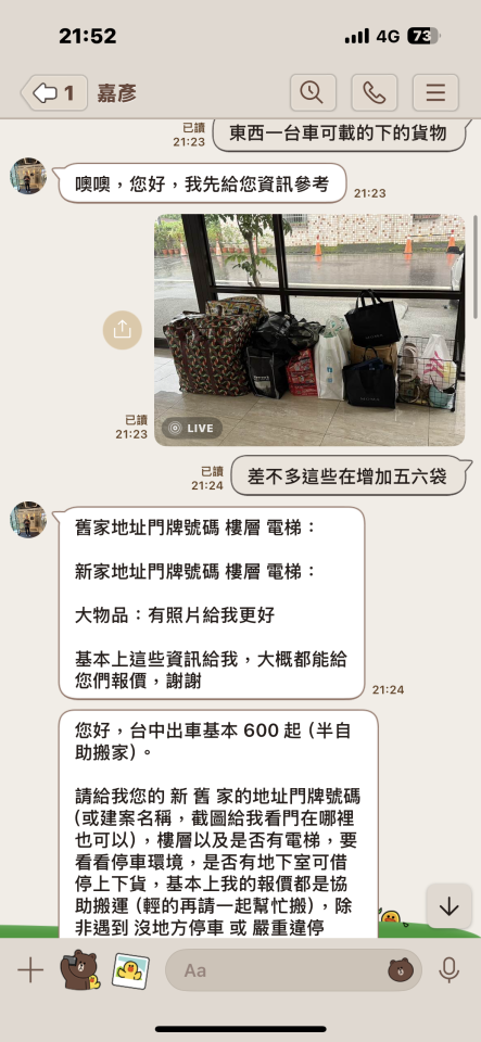 請給我您的 新 舊 家的地址門牌號碼(或建案名稱,截圖給我看門在哪裡也可以),樓層以及是否有電梯,要看看停車環境,是否有地下室可借停上下貨,基本上我的報價都是協助搬運 (輕的再請一起幫忙搬),除非遇到 沒地方停車 或 嚴重違停的。