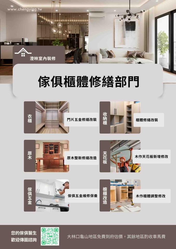常見問題 1.自我介紹 澄映室內設計 2.專業背景 室內裝修乙級技術士 3.服務方式 我們是室內設計工作室、家具木作工廠、 政府合格乙級室內裝修施工人員, 從專業配置規劃圖面到完工皆完整服務。 不管您是商空、預售屋、老屋翻新皆可免費諮詢看看。