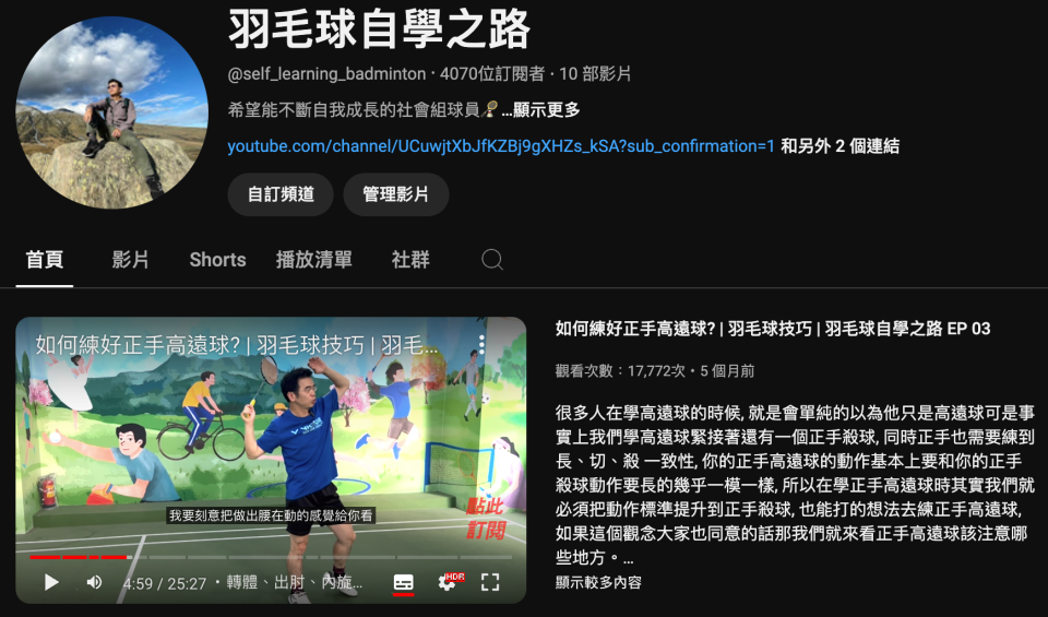 🎯 羽毛球教練|YouTube 頻道「羽毛球自學之路」經營者