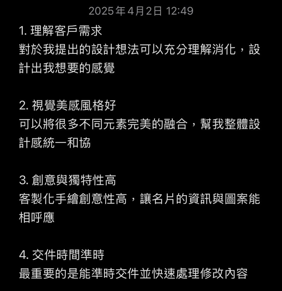 常見問題 1.自我介紹 正職為生物相關研究人員,已自學電繪多年,近期剛開始嘗試接案,任何作品調整需求均全力配合 以往只將作品放在私帳,目前為接案新手、剛開始經營創作者公開帳號,如果喜歡我的作品歡迎追蹤小紅書帳號:海靈(連結在最上方) 2.專業背景 TOEIC860分 日檢JLPT N1 3.服務方式 利用平日夜間及假日進行服務,可多次修稿,直至客人滿意 4.收費方式 可洽談 5.來往客戶 因有正職,原則上急件除非了解後對我而言可快速完成,否則以一週以上的案件為主。 6.案例分享 尚無 7.專業建議 尚無