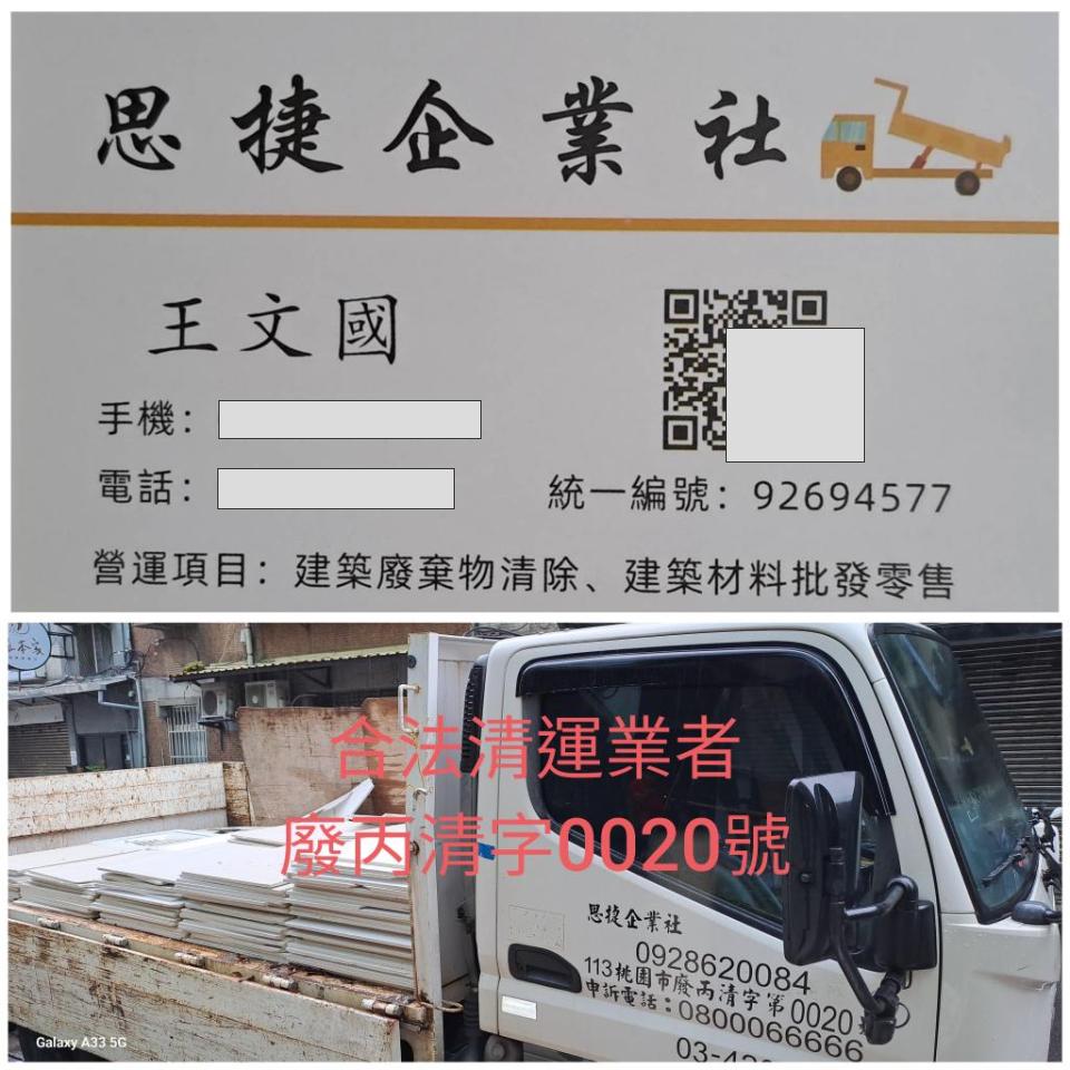 專家介紹 您好: 思捷企業社 合法廢棄物清運公司 (桃市廢丙清字第0020號) 我們的服務有: 拆除/清運/清潔/局家鍍膜 專業/認真/安心 讓我們幫您處理煩惱的家事 讓您回家後輕鬆的陪伴家人 顯示更多