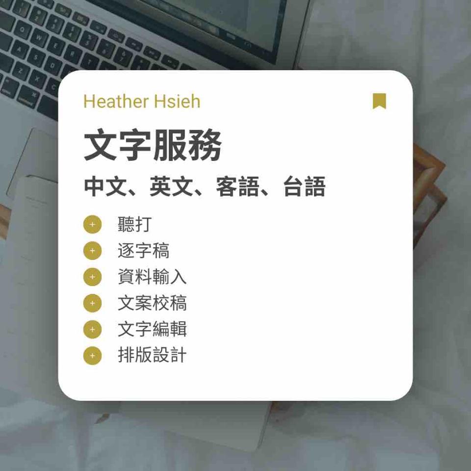 常見問題 1.自我介紹 外文系學士、教育系碩士 在英語和教育領域工作十年 曾於全美語幼兒學校擔任主任 主責撰寫將近 1000 份教案 2.專業背景 IELTS 雅思 7.0 (滿分 9.0) TOEIC 多益 965 (滿分 990) 3.服務方式 線上服務 4.來往客戶 補習班、學校 5.案例分享 教育工作十年間服務於基金會、幼兒園和補習班 ✨ 協助製作3-10歲之自編教材 ✨ 根據教材書寫教案 ✨ 根據課程需求設計教具、學習單、桌遊等 ✨ 編輯、校對與翻譯文案