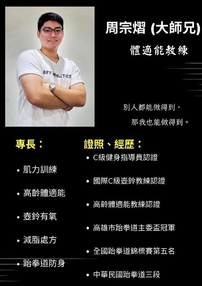專家介紹 擁有廣泛的健身教學經驗,能靈活因應不同年齡層需求,從高齡長輩的安全訓練到國小學童的基礎體能發展,皆能提供專業且貼近個人需求的指導,還有團課和私人課的教學經驗,不管是器材指導或是徒手肌力、、重量訓練間歇有氧等都是我自己本身有在訓練而且有做過教學的拿手項目 顯示更多