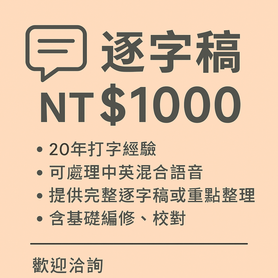 💵 收費合理(打字每千字約 NT$100~150、聽打依時數報價)