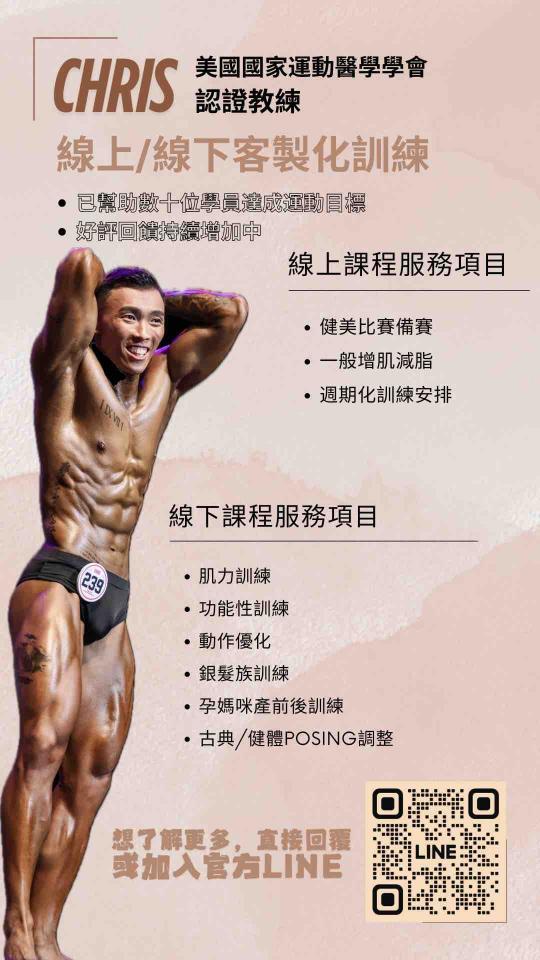專家介紹 我是Chris 擁有6年教學經驗的教練 🇹🇼中英雙語/🇺🇸Bilingual training 💯幫助百位學員達成運動目標 🏋️ NASM 私人教練 💪 銀髮族訓練/增肌減脂/產後恢復/健美備賽 📍 授課地點:七張Morefit、線上 顯示更多