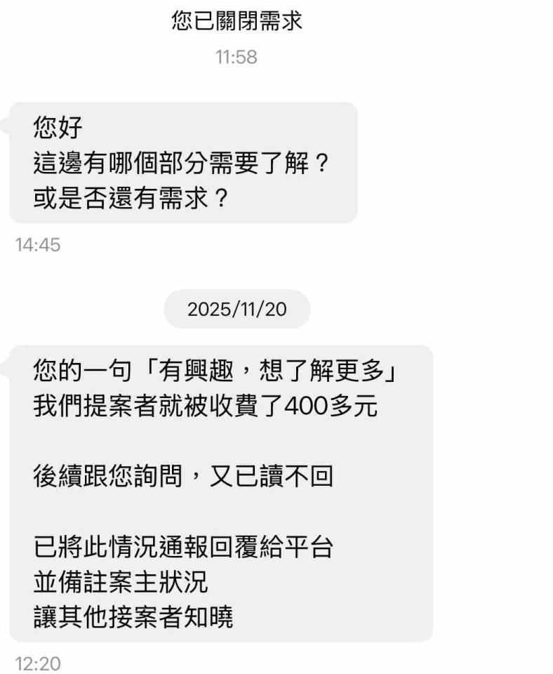 你自己po的截圖 是不是也看到了你已讀不回? 理性溝通前提是對方要有回覆 理性溝通前提是對方要有回覆 理性溝通前提是對方要有回覆 2025/11/18上午10點提案給你 不到一個小時,你就回覆要了解更多 後續跟你說可以先提供簡報看一下架構 你已讀不回 (以上你的截圖都沒有呈現) 再跟你詢問是否有哪邊想要了解 以及是否還有需求 你繼續已讀不回 要怪請去怪平台! 只要你隨便回一句我們就被收費! 不要以為出錢就是老大! 我們也在出錢! 甚至你根本都還沒花到錢! 不要以為只有你可以評價! 我們也可以評價你!