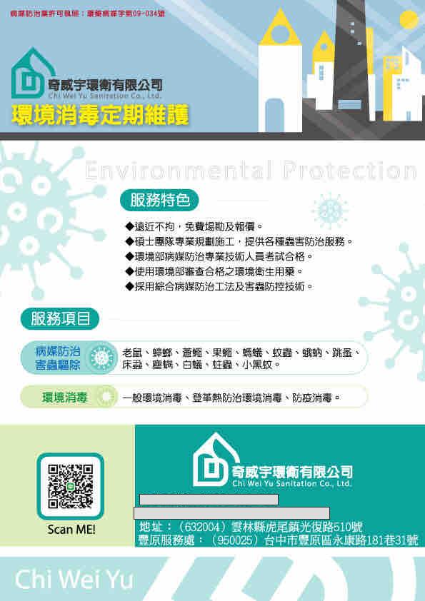 奇威宇環衛有限公司是一家專業的病媒防治公司,專注於提供高品質的病媒控制服務。我們致力於創造一個安全、健康的生活和工作環境。自成立以來,我們已建立了堅實的專業基礎和經驗,讓客戶可以放心將環衛需求交給我們。