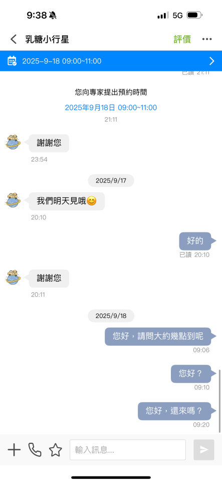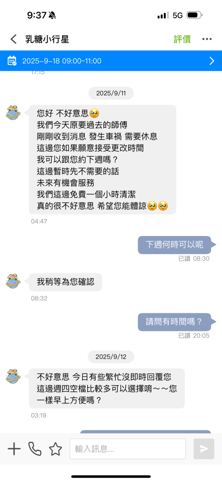 8:50人員到樓下等到9:30,電話聯繫不上,訊息不是每位人員都有權可以使用,小編已經前一天主動告知代表我們對案件的重視,我們也對第一次感到抱歉送一個小時的服務,建議每位客戶還是要注意陌生電話,謝謝您的一顆星