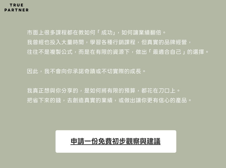 所以,我把自己定位成一位品牌夥伴。不會告訴你「一定能多成功」,但能陪你避開那些冤枉路,把資源花在刀口上。有人並肩同行,才能走得更穩、更遠。