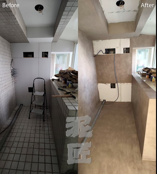 微水泥不同於傳統面材需要對於材料及施工方式較為了解的師傅.施工前必須要保持施工區域的乾燥.微水泥強度弱於磁磚畢竟不是燒結出來的.都是手工施作必然會有鏝刀紋理風格性會較為獨特