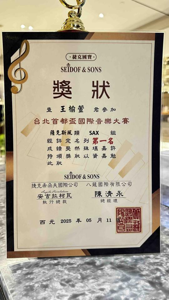 自幼開始學習小提琴與鋼琴,國小音樂班後改為低音管主修直至碩士,曾榮獲2004年桃園縣學生音樂比賽優等第一名、2005年全國音樂比賽優等第一名、2007年台北市學生音樂比賽第一名,2025年台北首都盃國際音樂大賽薩克斯風SAX組第一名。參與校内及校外樂團,也多次至國家音樂廳及各地文化中心演出;除此之外也參與音樂相關營隊,如徐家駒低音管室內樂營、管樂魚管樂器維修暑期集中營。曾受郭怡芬、Halvard Opem、 Frank Forst等大師指導。演出過貝多芬第九號交響曲、動物狂想曲、春之際…等經典曲目。